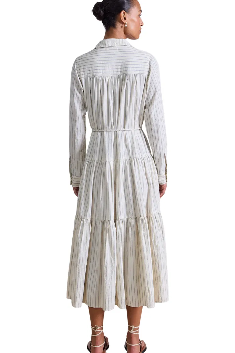 - Shirt collar, dropped shoulder, front button placket, two tiered skirt, removable self tie belt included
