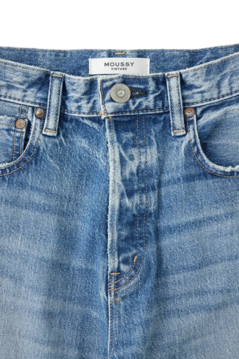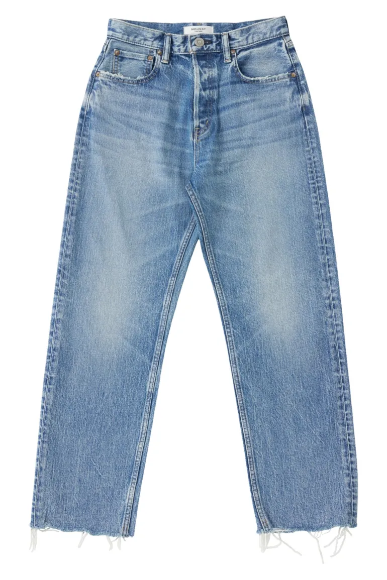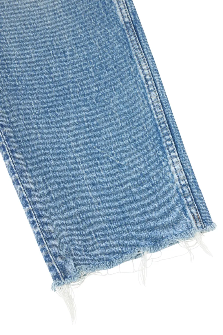 These straight-leg jeans feature a frayed hem in faded medium-wash denim