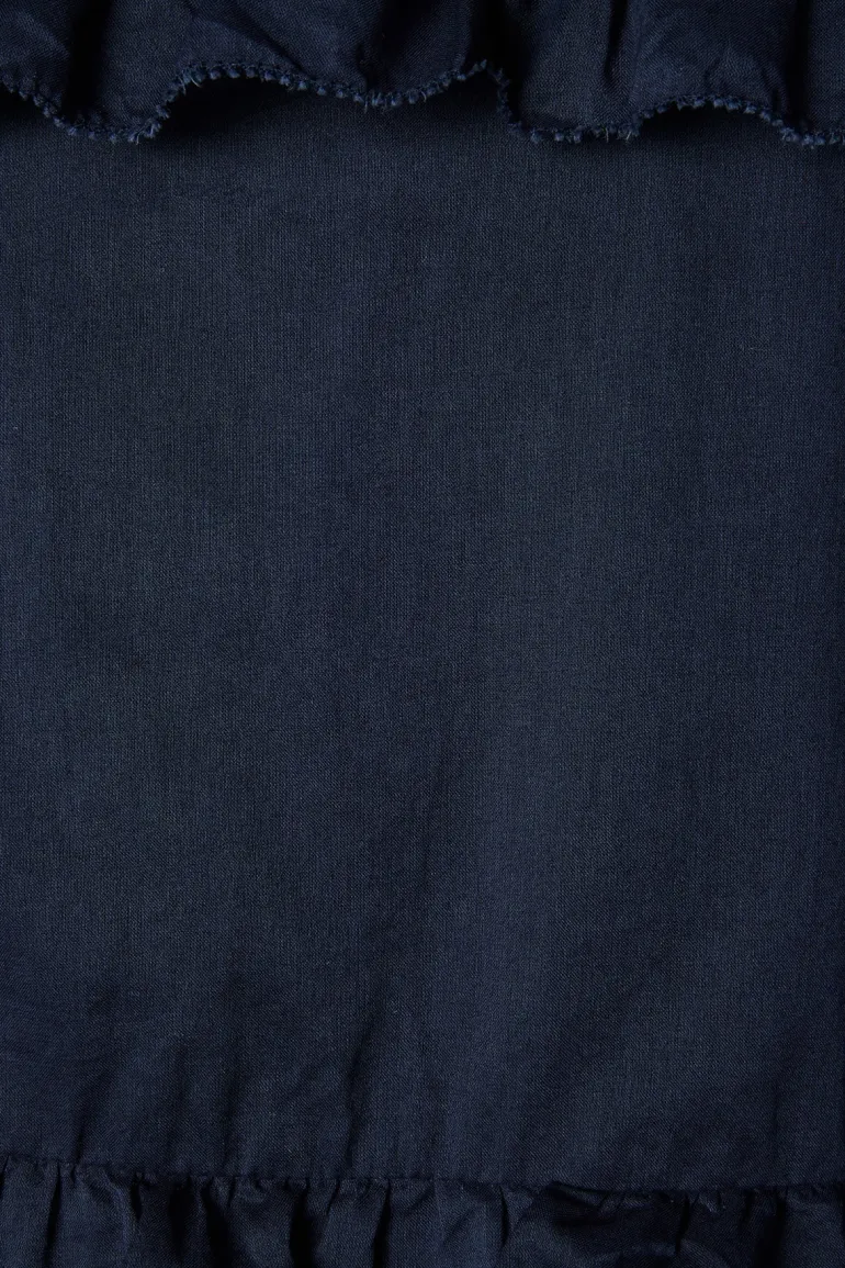 - The neckline is fully trimmed with a circular-cut ruffle that elongates its drape, and the front v-neck is reinforced by a snap enclosure for optional coverage.
