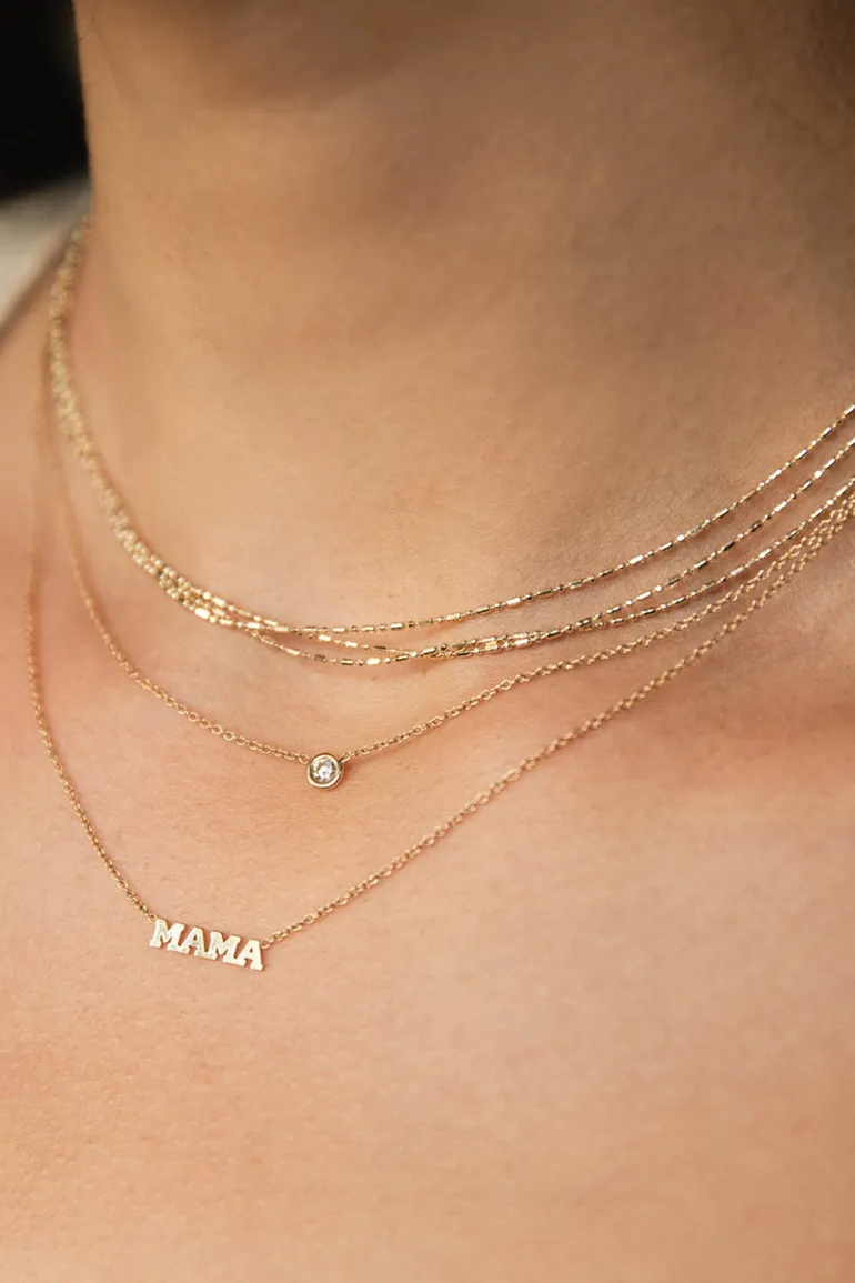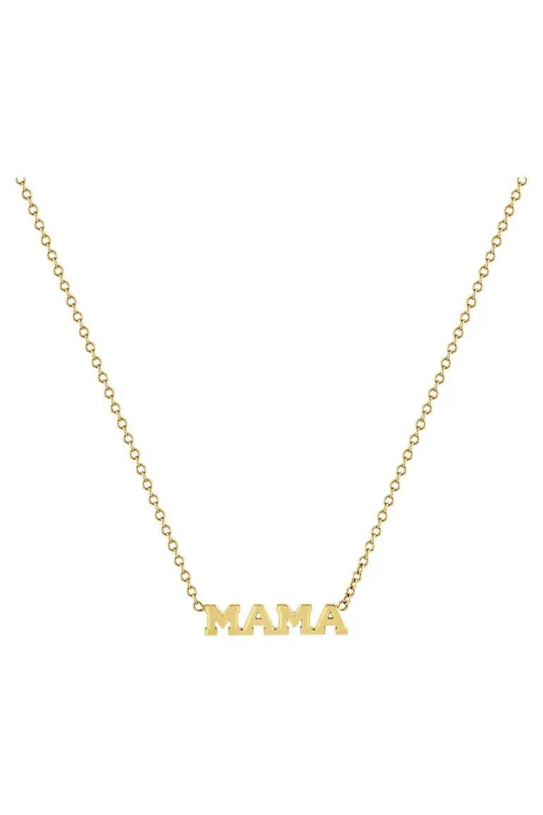 14k gold cable chain necklace with “MAMA” in tiny capitalized block letters