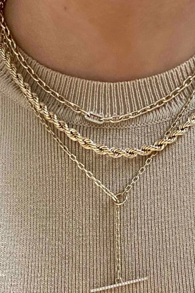 14k gold medium hollow square oval link chain necklace with a single pavé diamond covered link in the center with diamonds on both sides of the link