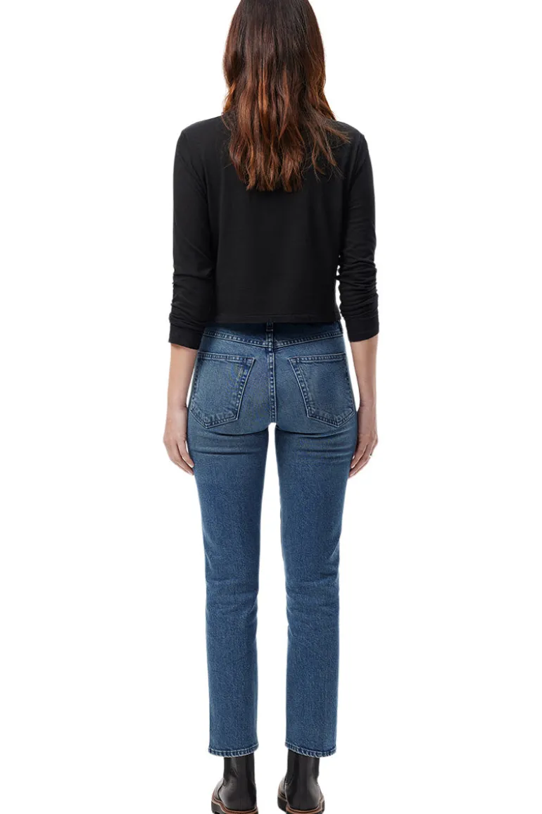 TheChloe cropis a high-rise with a straight, cropped leg that hits just above the ankle.