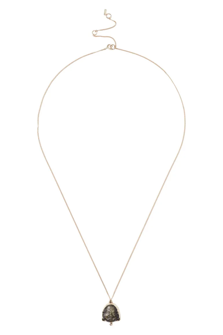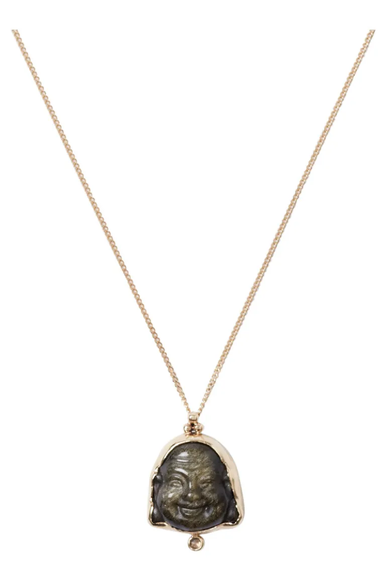 This 14k yellow gold necklace features a carved jasper Buddha wrapped in solid gold with a diamond inlay.