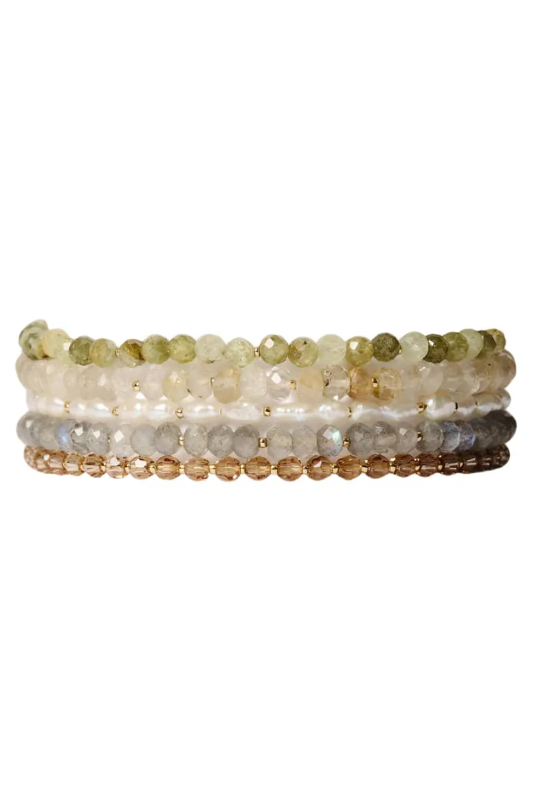Naked wrap bracelet featuring blue labradorite, green garnet, crystal, freshwater pearl, and rutilated quartz.