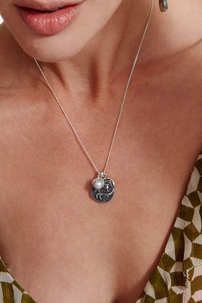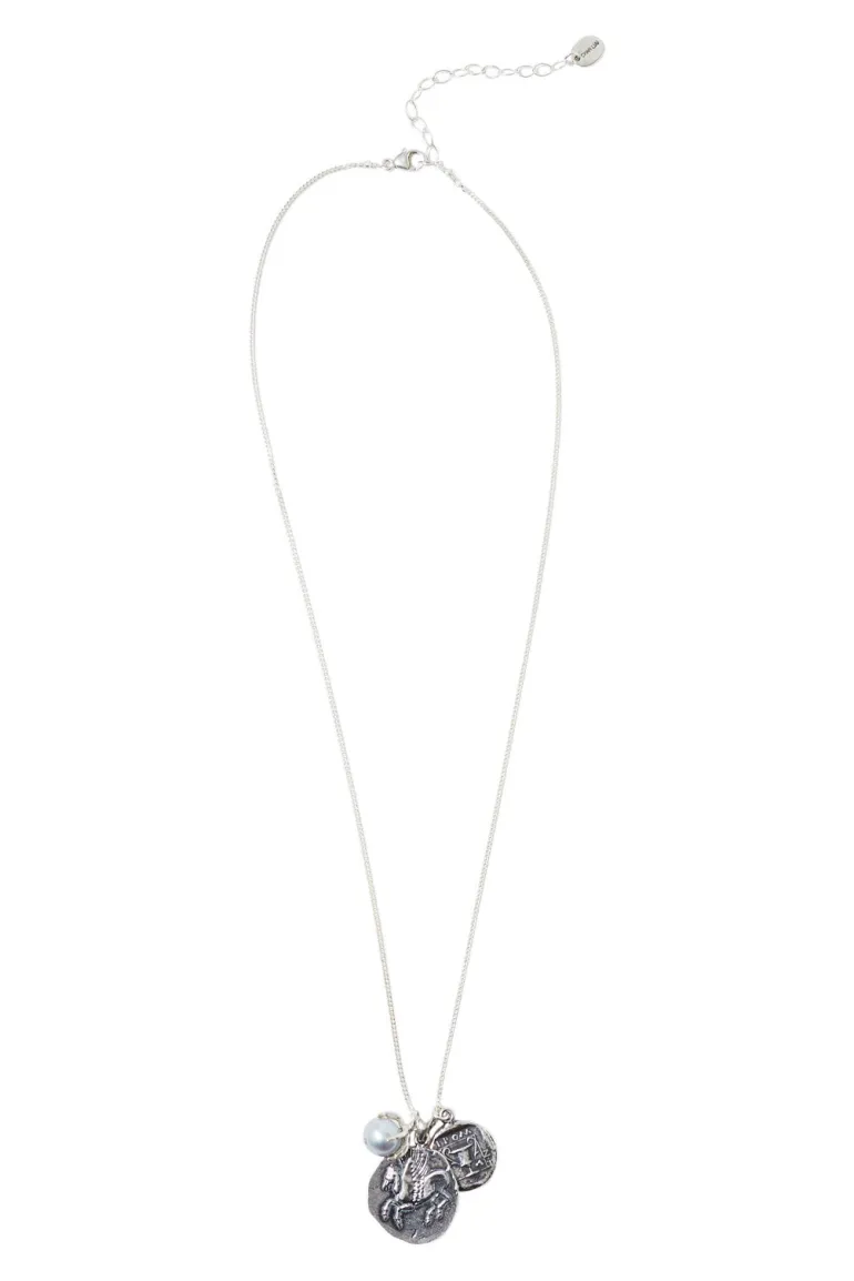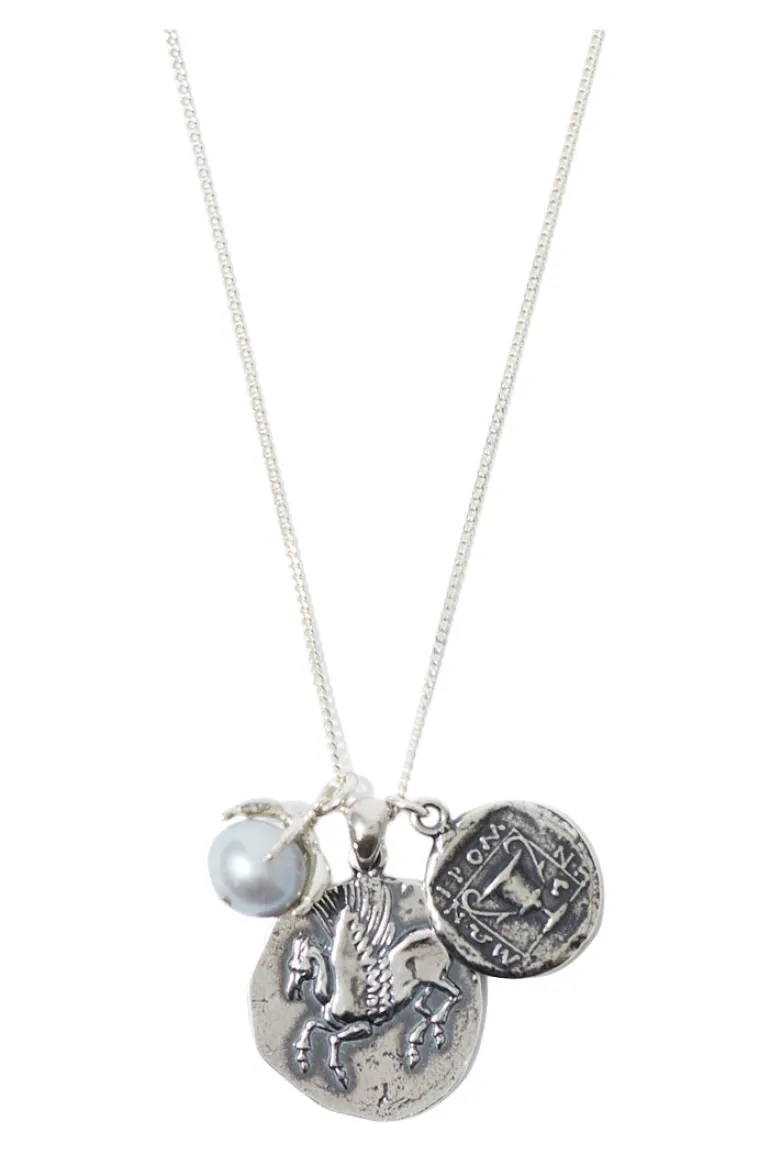 Sterling silver necklace featuring ancient Greece Pegasus coin castings and talon help freshwater pearl.