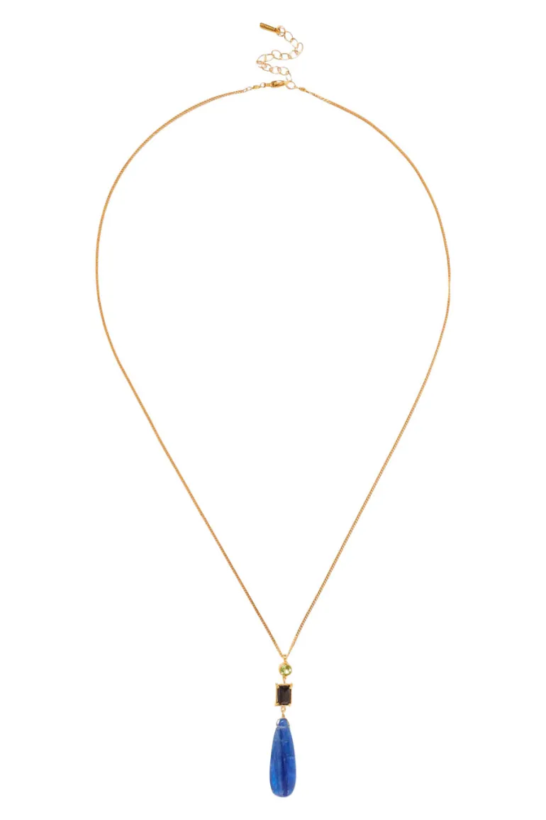 Gold chain necklace with a tiered pendant featuring kyanite, hypersthene, and peridot gemstones.