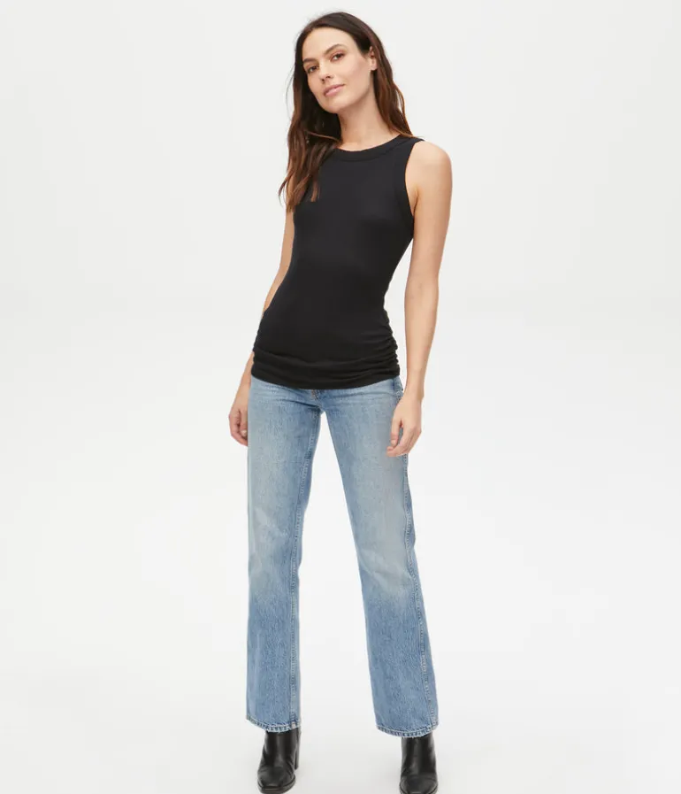 - Made in Ultra Rib fabrication, this shoulder-baring tank has ruched sides for an ultra-flattering fit.