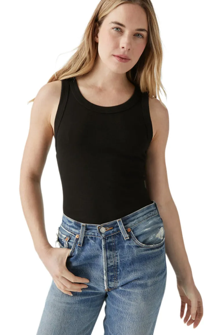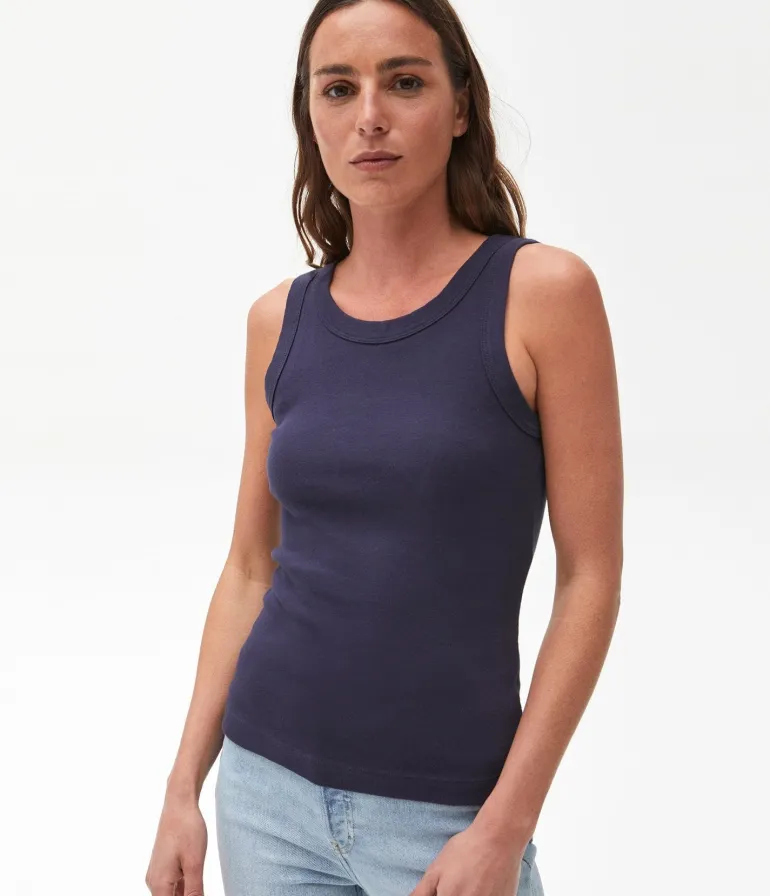 This fitted wide binding tank is featured in soft ribbed jersey.
