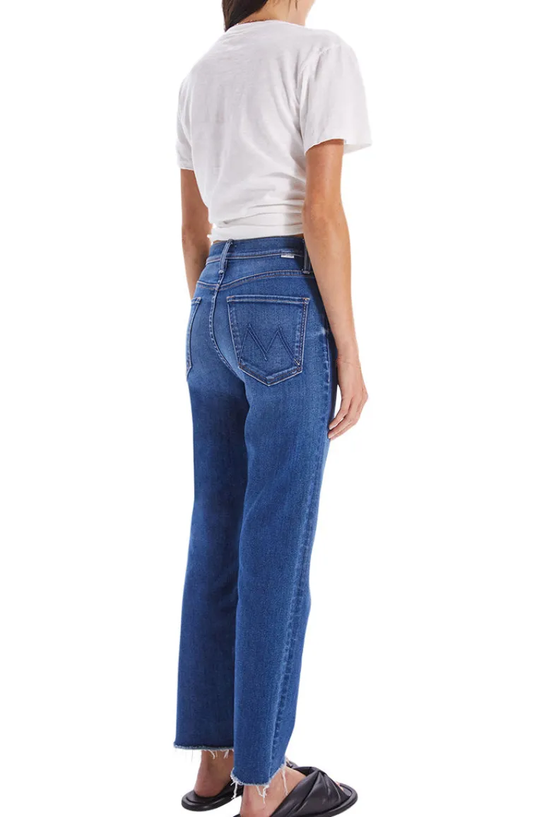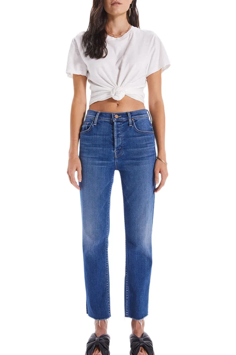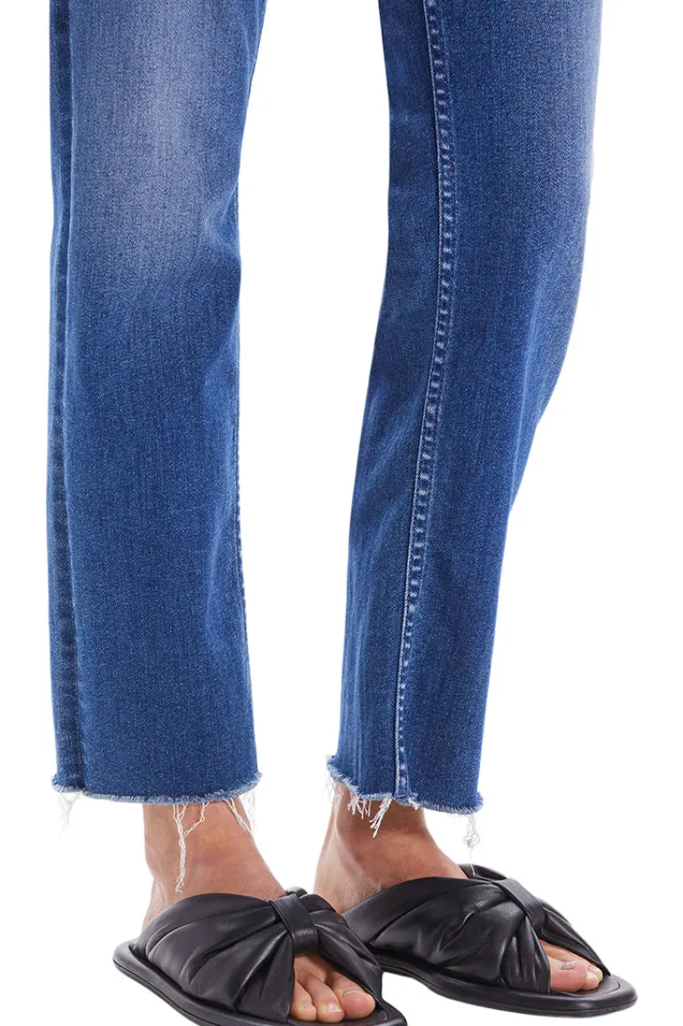High-rise jeans with a straight leg, ankle-length inseam and a frayed hem.