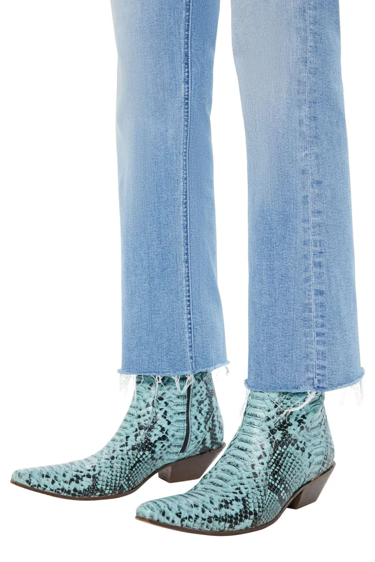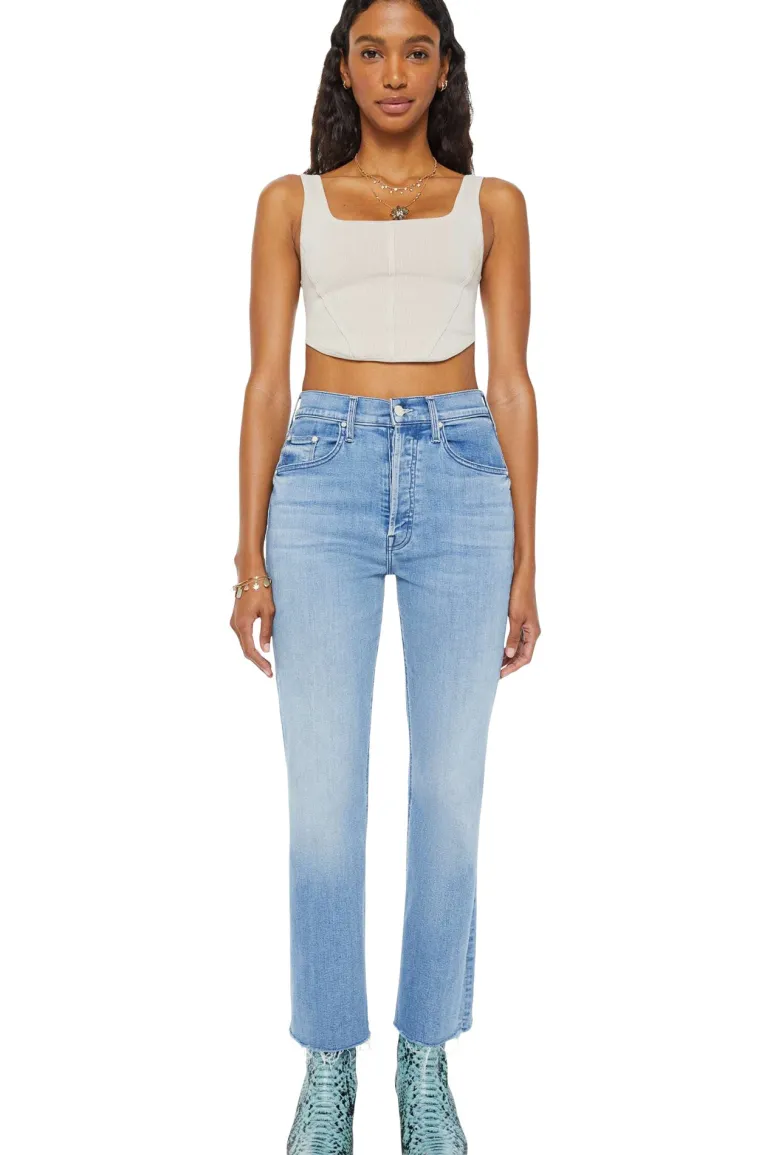 A high-rise flare with a button fly and a frayed hem that hits at the ankle.