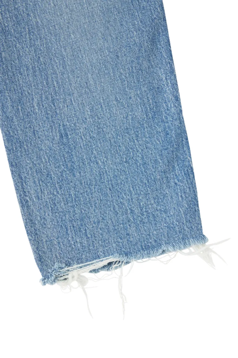 These straight-leg jeans feature a frayed hem in faded medium-wash denim