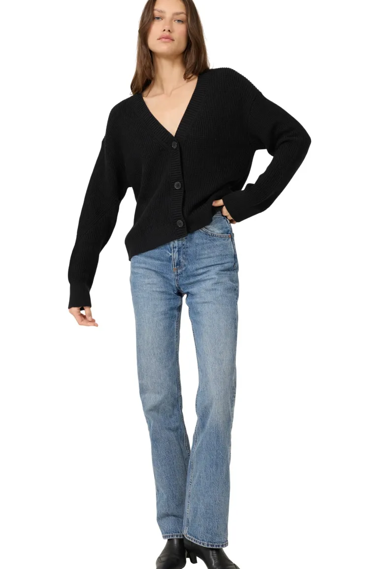 Knit from a silk/cotton blend, this soft and easy cardigan features traveling ribs throughout the body and sleeves.
