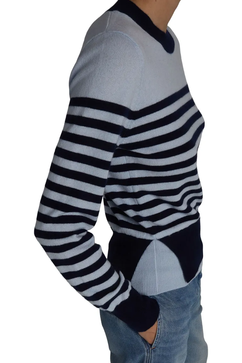- Made with a soft and lightweight cashmere wool blend, this sweater features a layered waist detail that adds a touch of elegance to its casual stripe design.