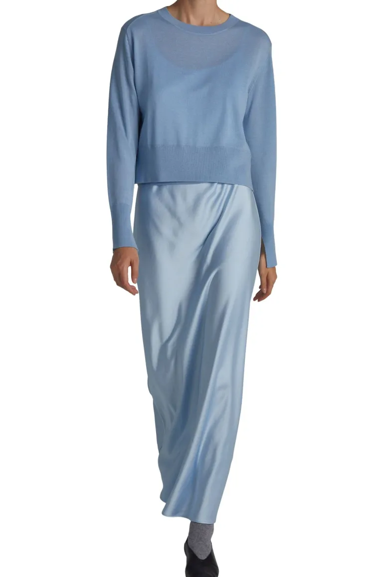 Introducing the Elodie Layered Crewneck in baby blue, finely crafted from Italian Merino wool with a fine gauge.