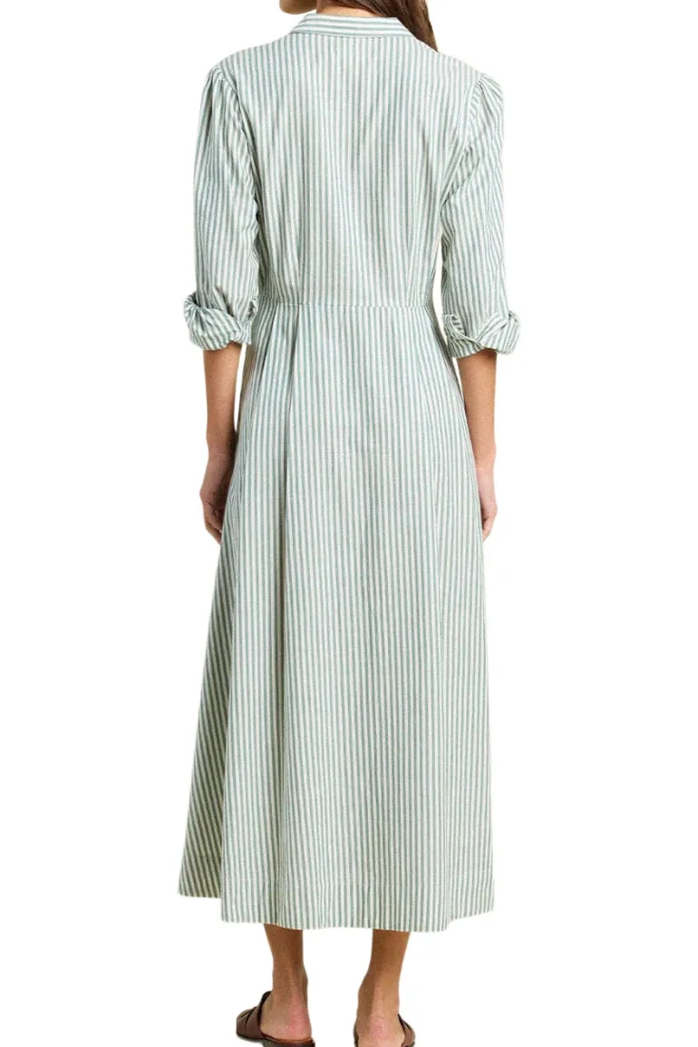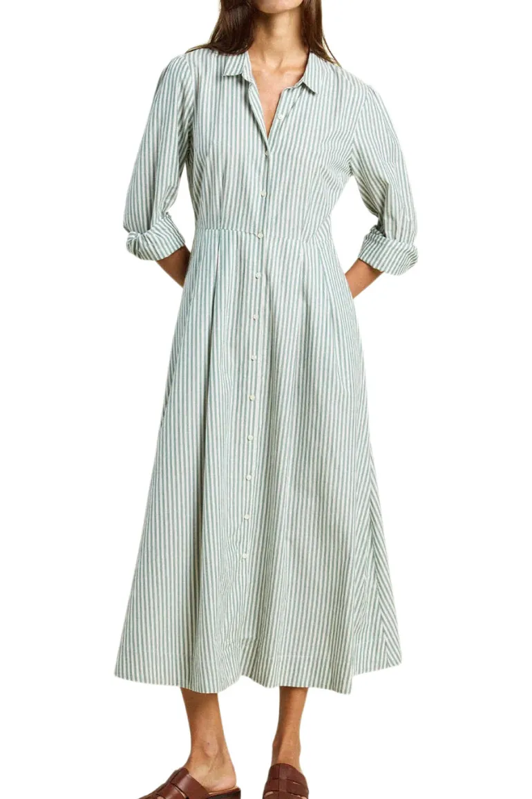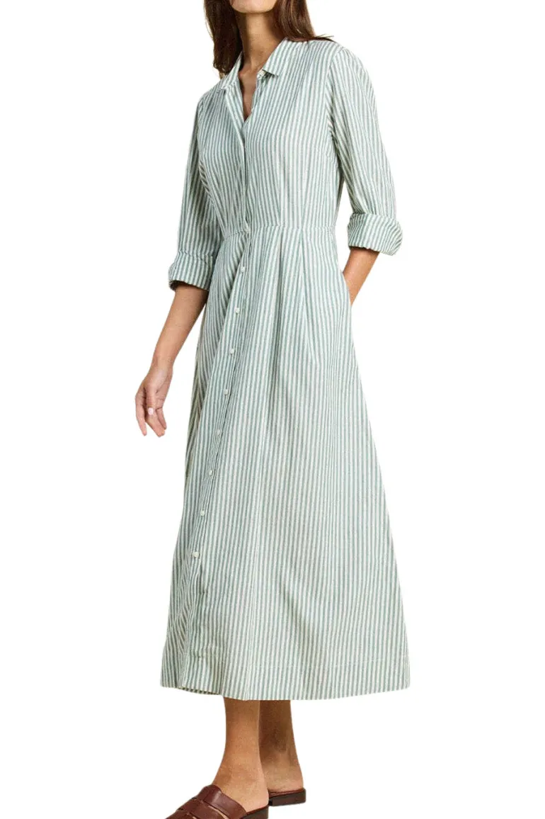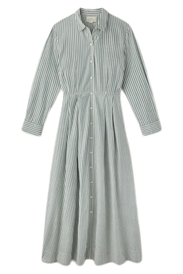 The Emmelie Dress is a vintage-inspired shirt dress with a tailored pleated waist, full-button front and elongating midi hemline.
