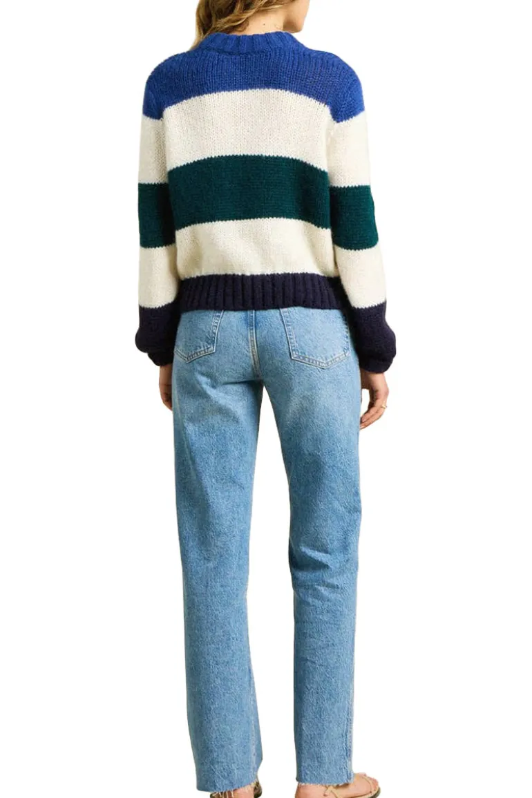 - The softest cotton yarns knitted in a textured micro-stripe in alternating blues and antique white.