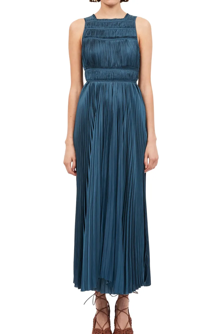 - Intricately pleated throughout, this sleeveless dress has delicate frills along the bodice and cascades to a midi hemline.
