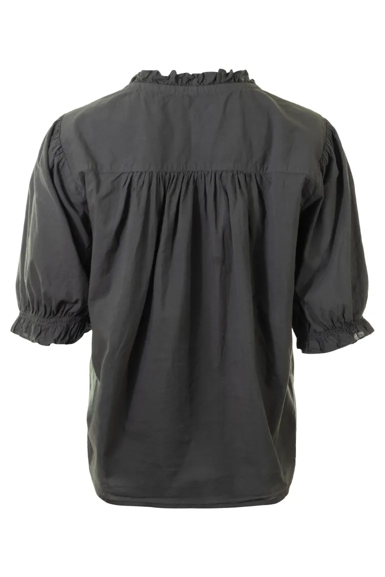 This femme button-front blouse features ruffle trim along the neck, placket, and sleeve cuffs.