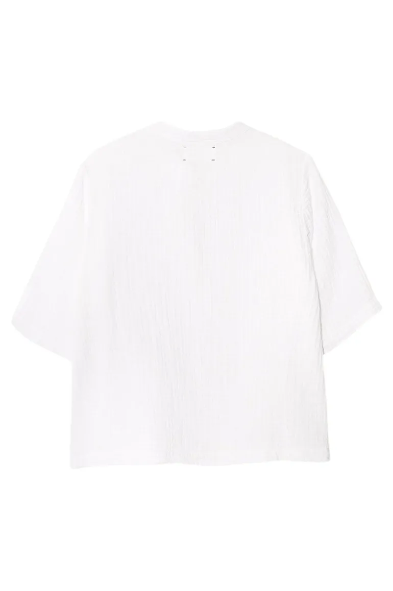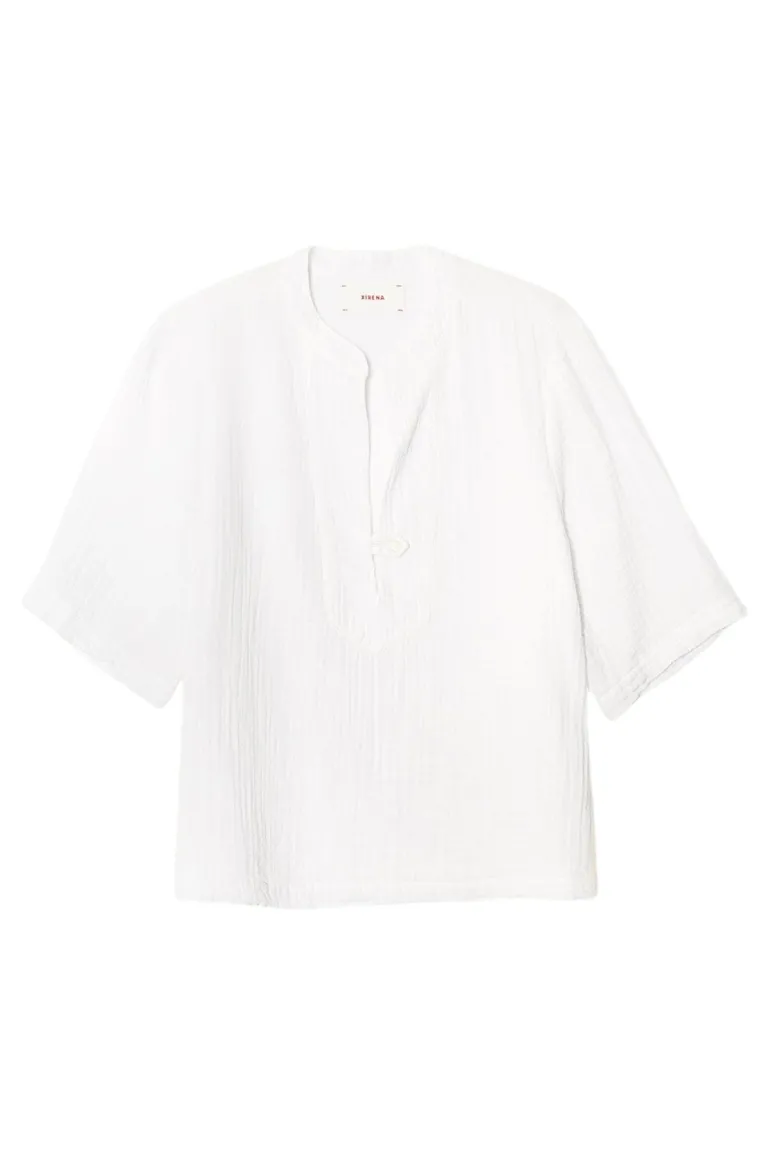 Ports is a boxy pullover top with a V-neck, button tab closure, elbow sleeves, and band collar lined in cotton poplin for a clean finish.