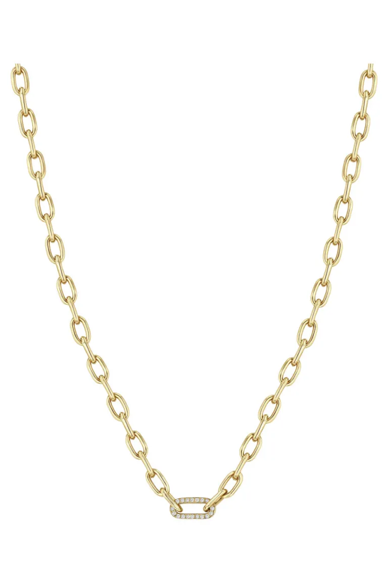 14k gold medium hollow square oval link chain necklace with a single pavé diamond covered link in the center with diamonds on both sides of the link
